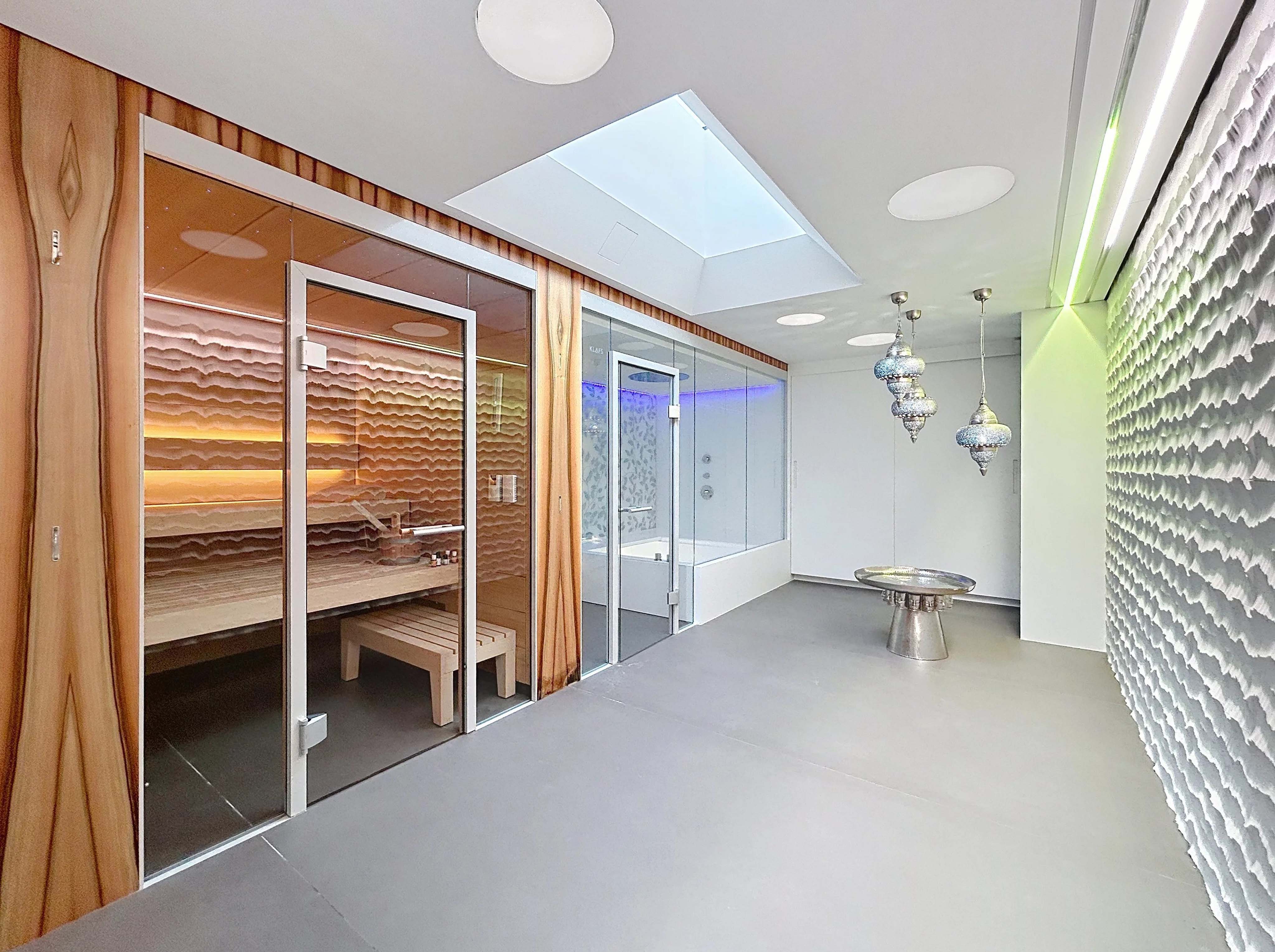 Répartie sur trois niveaux, elle comprend 12 pièces, 6 chambres, 6 salles d’eau, une suite parentale avec dressing, un vaste niveau inférieur modulable avec grande cuisine secondaire et home cinéma, un espace wellness avec sauna et bain onsen, une piscine chauffée 8 x 4,5 m utilisable toute l’année (abri motorisé), un garage fermé et plusieurs places couvertes.
