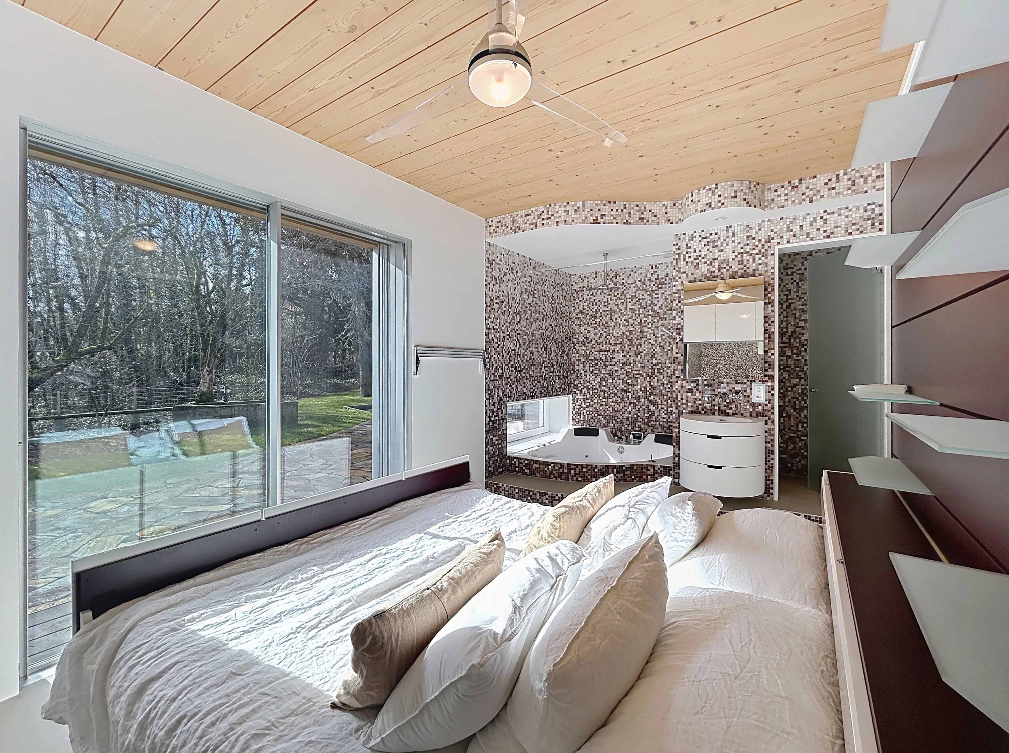 L’espace nuit comprend des chambres confortables, dont des suites parentales avec salle de bain privative et accès extérieur. Le sous-sol est dédié au bien-être et aux loisirs avec sauna, jacuzzi, salle de jeux, cave à vin, buanderie et local technique. Un jacuzzi extérieur vient compléter cet espace détente.